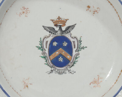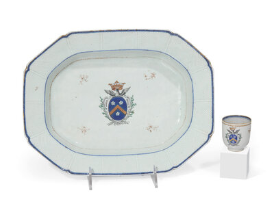 All decorated with armorial crest surmounted by eagle with crown above, with blue enamel and gilt rims, comprising an octagonal serving platter, two soup plates, two small plates, two saucers, two tea bowls, and a teacup, the undersides bearing accession numbers, 79.500.18-1, 2, 4, 5, 6, 7, 8, 9, 10, and 12, and labels with old Winfield Foundation accession numbers.