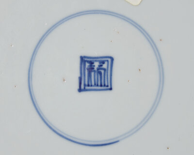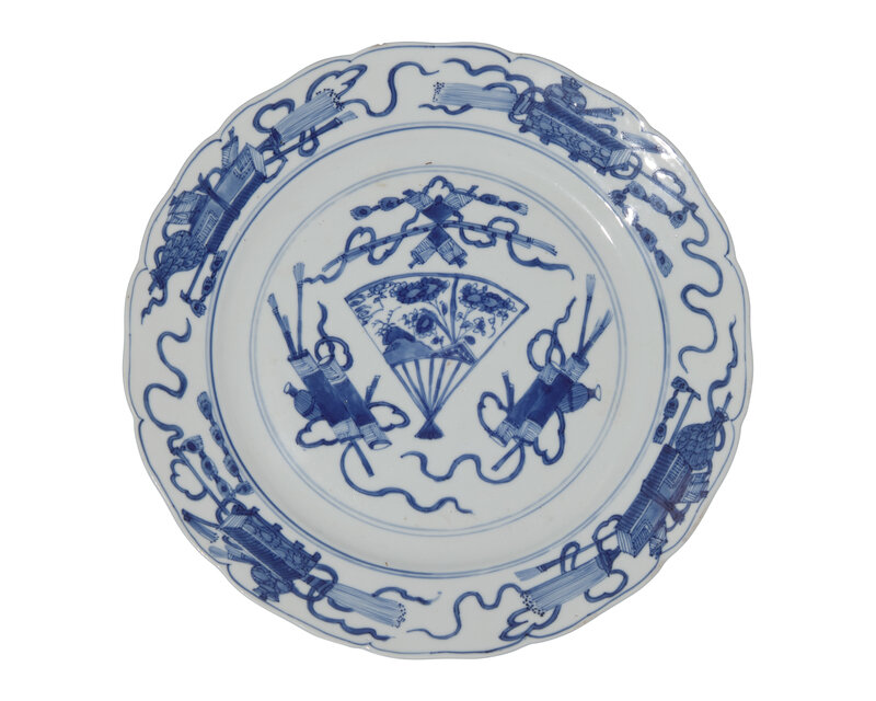 With scalloped rims, each decorated with fans and precious objects, with mark to underside.