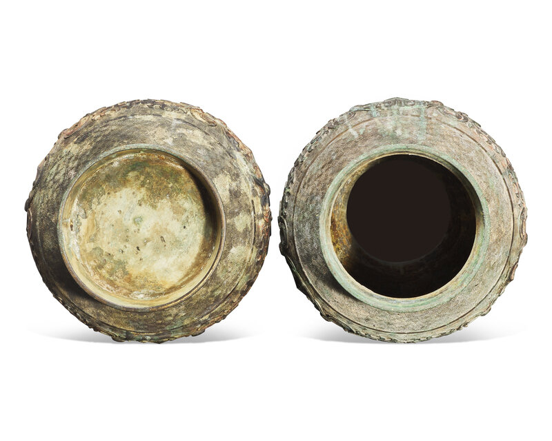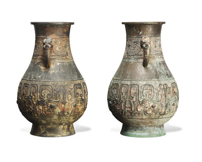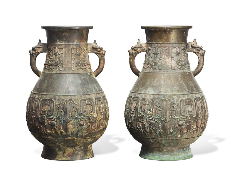 The lower registers decorated with stylized beast masks, shoulders embellished with phoenix motifs, two handles cast as dignified beast heads.