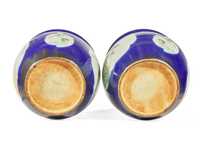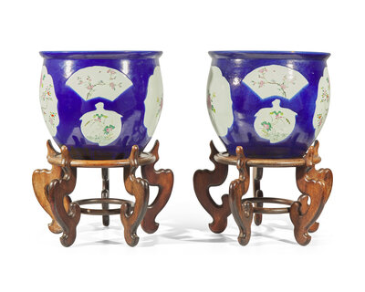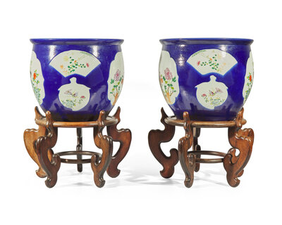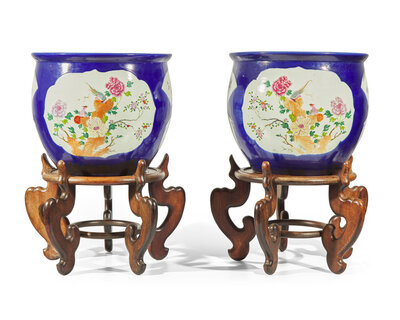 A pair of large Chinese Famille Rose-decorated cobalt-ground jardinières, late Qing to Republic period