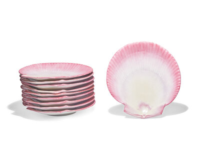 A set of ten Wedgwood pink shell-form porcelain plates, England, bearing date mark for 1877-1878