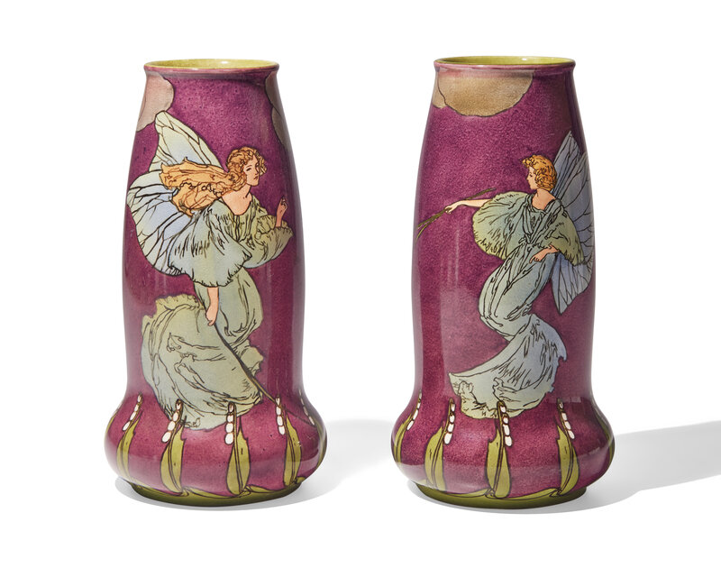 A pair of hand-decorated Doulton Lambeth pottery "fairy" vases, decorated by Margaret Walker, Lambeth, England, 1891-1910