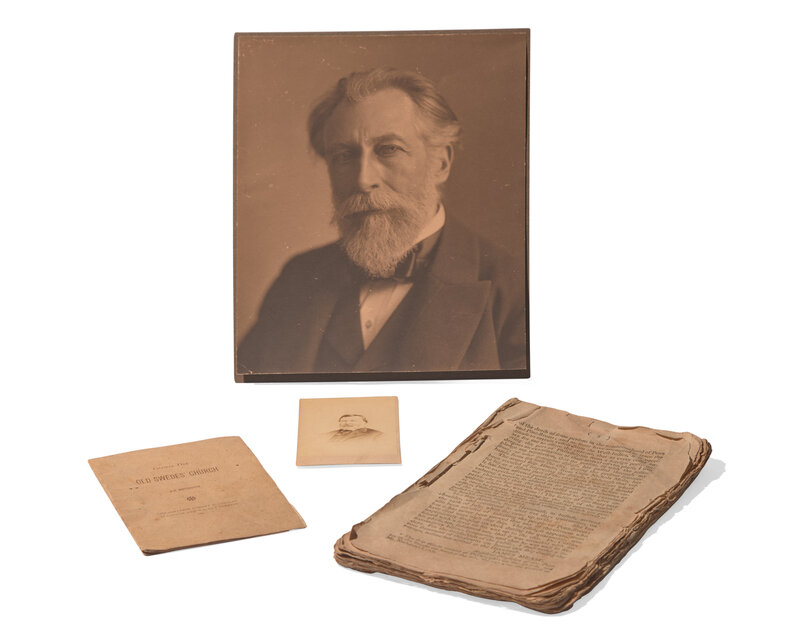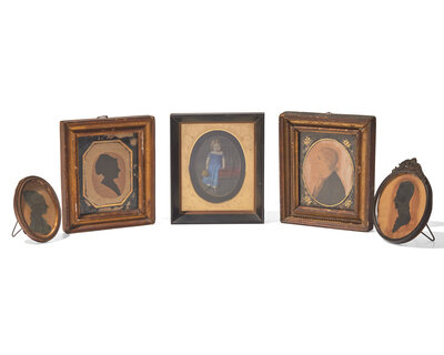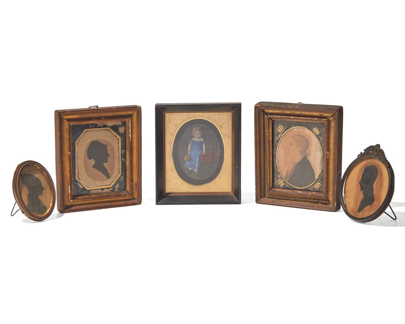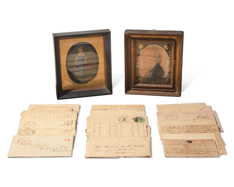 Comprising a small profile portrait of George Ord, Sr. (1741-1806), pencil and watercolor on paper, with reverse glass-painted mat, giltwood frame, verso inscribed and dated, "Captain George Ord 1770"; a hollow-cut silhouette profile portrait of Rebecca Lindemeyer Ord (1742-1823), with reverse glass-painted mat, giltwood frame, verso inscribed, "Rebecca Ord (née Lindemeyer)/ of Geo Ord- taken about 1776"; a hollow-cut silhouette profile portrait of George Ord, Jr. (1781-1866), inscribed verso, "...George Ord 2nd...Margaret Biays Ord/ taken about 1819- Still life and...artist", brass case; a cut-out silhouette profile portrait of Rebecca Ord McMullin (1806-1885), stamped verso, "Cut with Scissors by Master Hubbard Without Drawing or Machine," and inscribed verso, "Rebecca Ord McMullin at 18- daughter of John & Maria Ord McMullin/ taken 1817/ 18 yrs old," brass case; a portrait miniature of an unidentified young girl holding basket and leaning on a side chair, watercolor, matted and framed; two letters written to George Ord, Jr. by his sister Maria Ord in Philadelphia, one dated, "July 10th 1792," and both with mention to a Mrs. Woodhull; and a selection of letters, mostly dated from the 1830s and 1840s, sent to Ann Maria McMullin (1811-1890, later Ann McClure after marrying John McClure) and Rebecca Ord McMullin (1806-1885) at various addresses including Philadelphia, Bristol (Pennsylvania), Baltimore, Clear Spring (Maryland), Pemberton (New Jersey), etc.; many of these letters sent from relatives in Tallahassee, Florida, including Rebecca White and A.P. McMullin, and seven postmarked from Tallahassee, with various discussions from niece, Rebecca White, including but not limited to: blossoming flowers such as Althea, Cape Jessamine, "The Crape Myrtle is hanging in pink bunches like ripe watermellons (sic)", as well as peaches ripening and lack of rain, as well as death of a sick child and Uncle John being taken as a prisoner of war in Mexico and who's escape was posted in New Orleans newspapers; and various discussions by a relative of the name A.P. McMullin: from the Ship Julia, describing the rough thirteen-day voyage near places like Cape Hatteras, the Bahamas, and the Tortugas, with a "young and handsome captain"; and mentions of conditions in Apalachicola, Florida including apples, champagne, a furnished cabin, sickness and measles, a log cabin with no glass pane and mud chimney, and "6 friendly Indians"; a piece of advice addressed by Silas Ballou to James Harkness, sent by DeForest Ballou, dated "1864"; a small pamphlet, Gloria Dei, Old Swedes' Church: An Etching by Ludwig Ernst Faber From A Drawing By Prof. H. Faber (Philadelphia: Robert M. Lindsay, 1886); two photographs (cabinet card and carte de visite) of unidentified men, the carte de visite by P. Gutekunst, Philadelphia and dated, "March 1866"; and a partial and fragmentary copy of a book describing the yellow fever outbreak in Philadelphia in the year 1797, including "List of Burials", "Meteorological Observations", "Donations Received", and "Donations of Flour, Vegetables, &c."