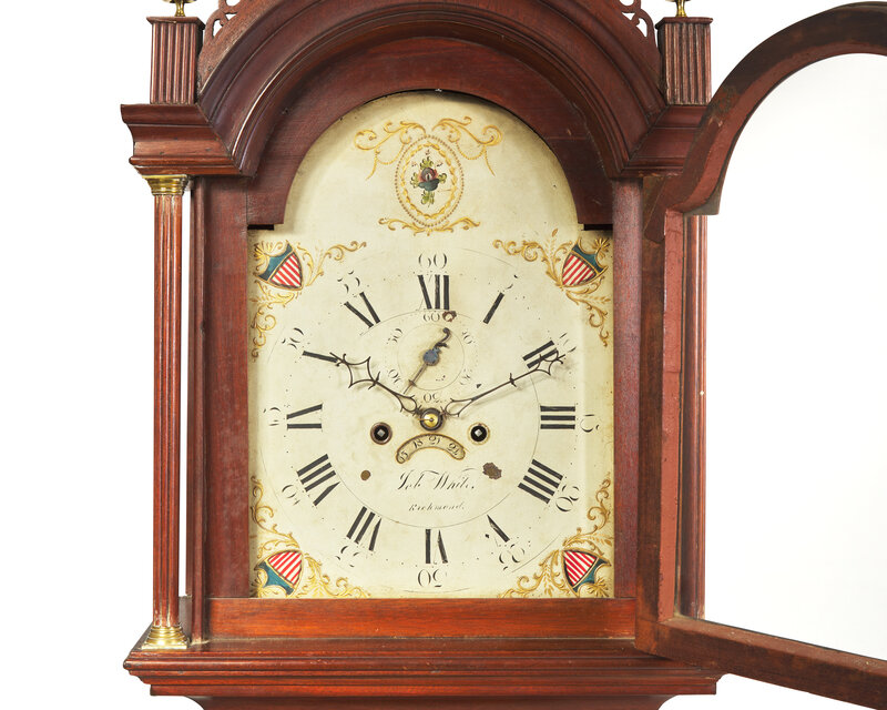 The painted dial decorated with American shields and inscribed, “Job White Richmond,” made in Boston, MA, in a Roxbury-style case.