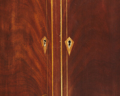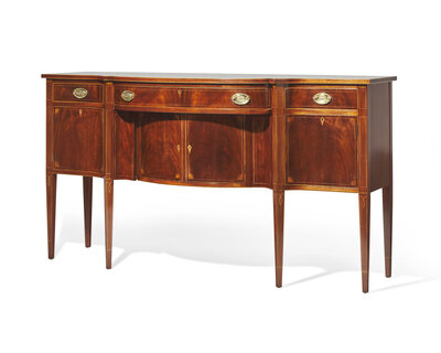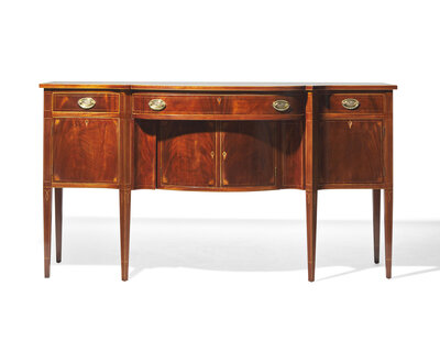 With serpentine top, over three drawers, above two doors flanked by two side doors, revealing interior storage compartments, on tapered legs.