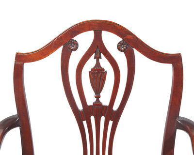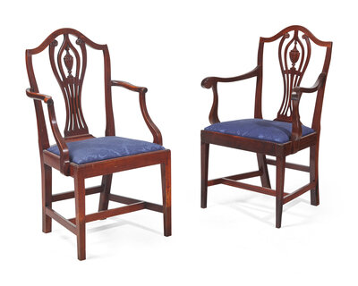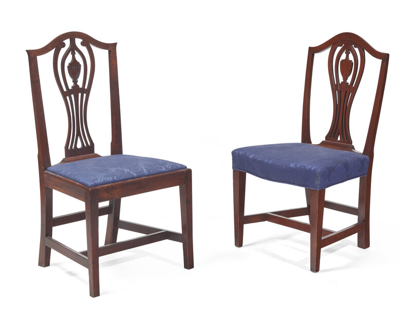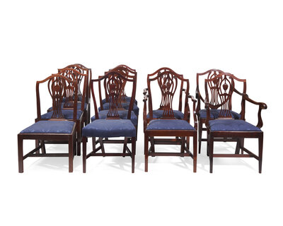 Comprising four armchairs and eight side chairs, all with crest-rails and splats modeled after the same pattern, but including individual chairs of varying design features, some with slimmer or wider proportions, some with over-upholstered serpentine seats versus squared-off slip seats, some with Marlborough legs versus tapered legs, each upholstered with conforming contemporary upholstery.