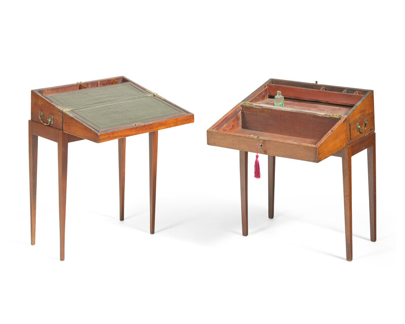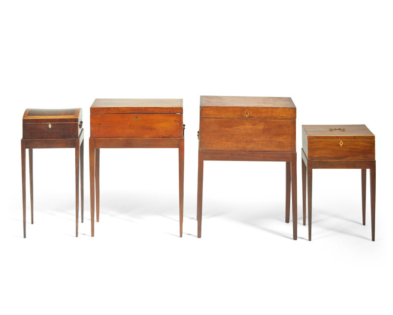 Comprising two writing boxes, containing interior compartments, and two document boxes, one retaining period paper to interior, the stands evidently of more recent manufacture.