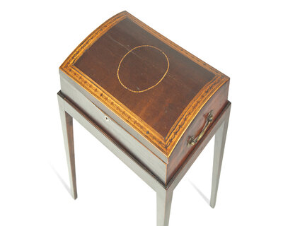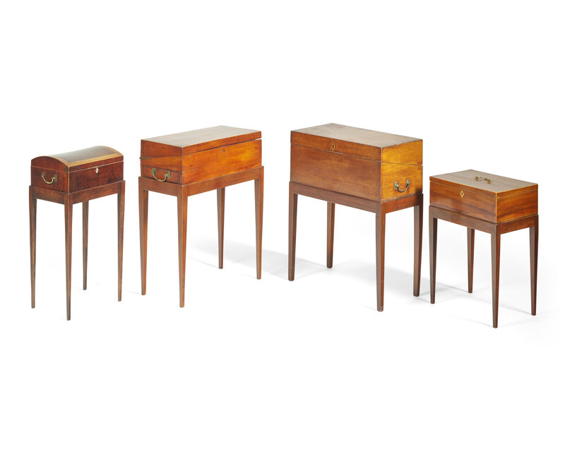 A group of four George III inlaid mahogany writing and document boxes on later stands, late 18th / early 19th century and later