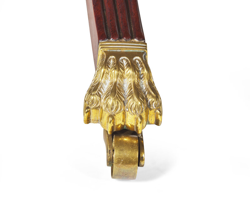 Of exotic grained Santo Domingo mahogany, boldly turned support, cast brass paw feet on casters.