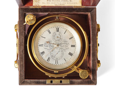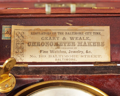 With silvered dial, signed, “Bliss & Creighton/ New York/ No. 711,” retaining retailer label to interior, inscribed, “Regulators of the Baltimore City Time/ Geary & Weale/ Chronometer Makers/ And Dealers of Fine Watches, Jewelry, &c./ No. 169 Baltimore Street, Baltimore," housed in mahogany lift-lid box.