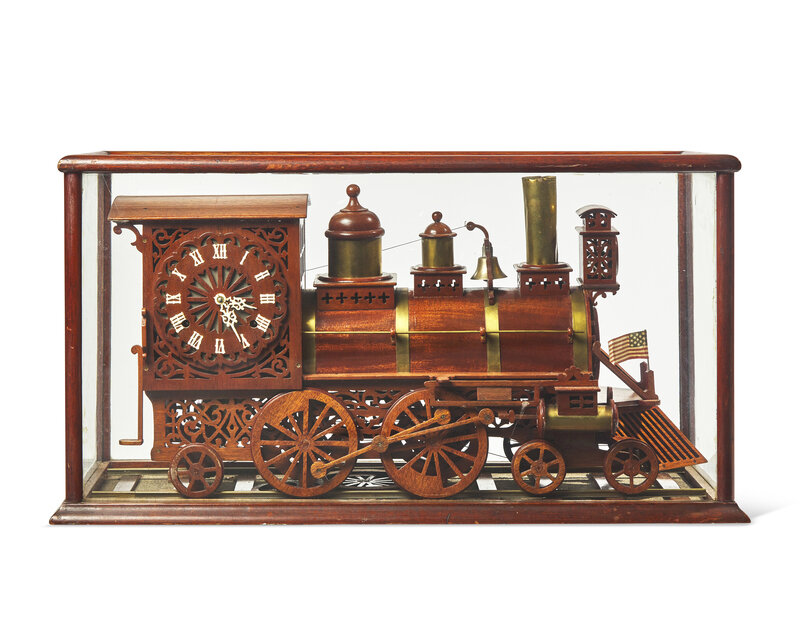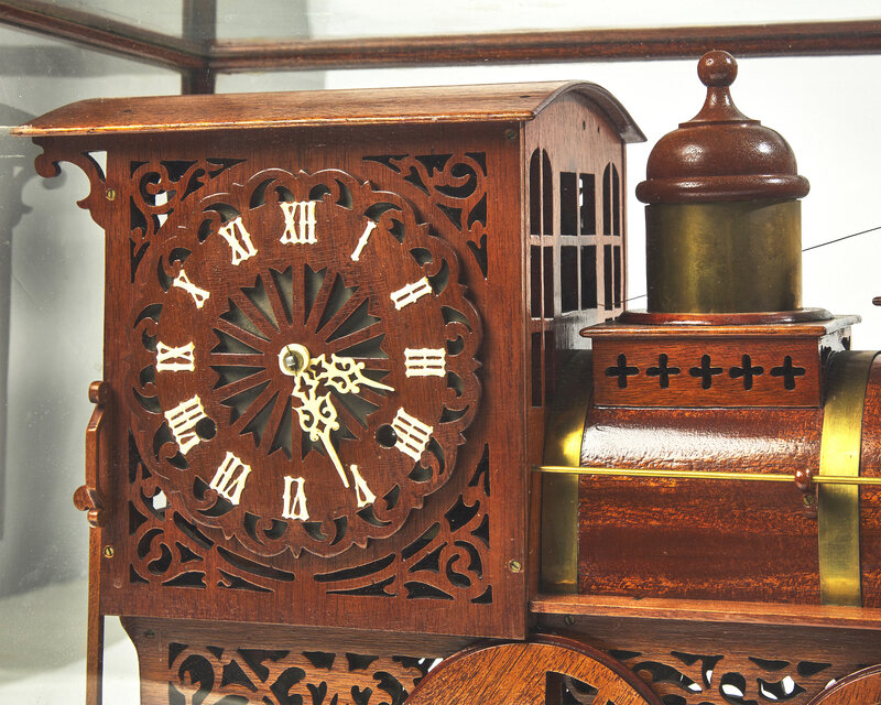 A brass-fitted mahogany 1886 steam locomotive / train fitted with clock, made by R. Davidson, April 10, 1910, works by Waterbury Clock Co.