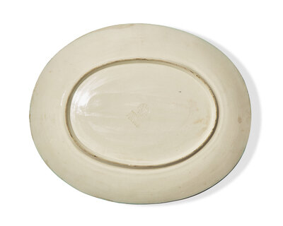 white earthenware clay oval dish with decoration in engobes under partial brushed glaze.