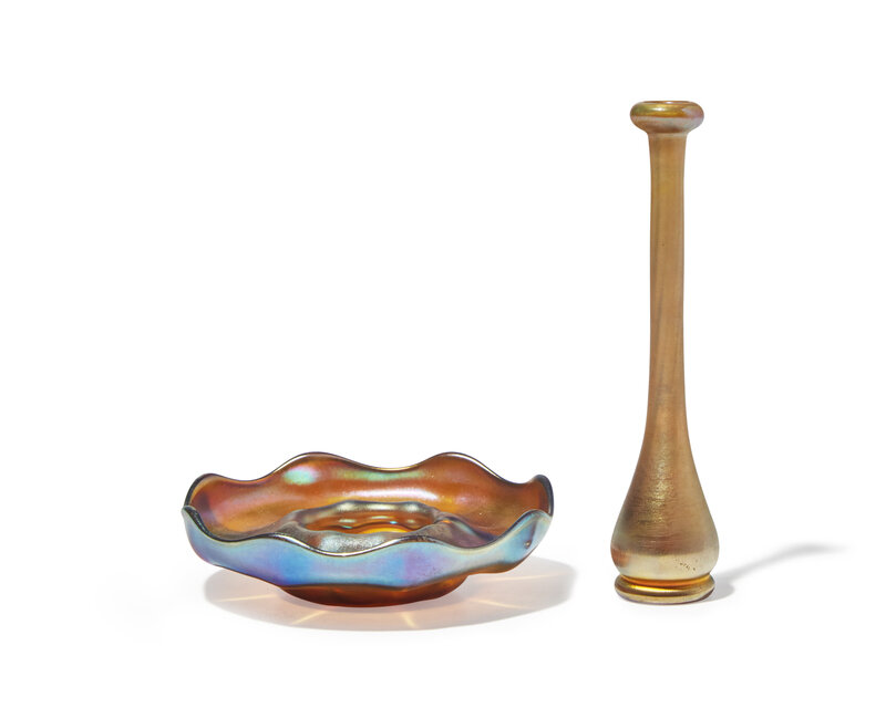 The bud vase etch-signed to underside, 9392H L.C. Tiffany/ Favrile; the candleholder with scalloped rim, etch-signed to underside, 1959/ L.C. Tiffany - Favrile