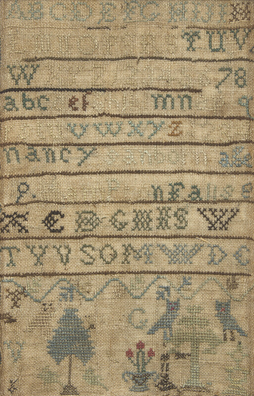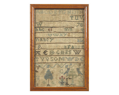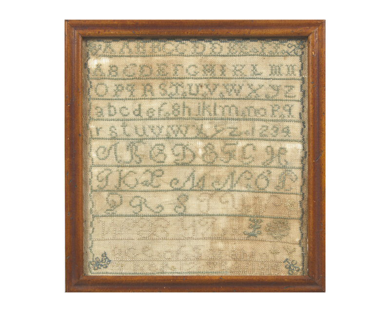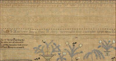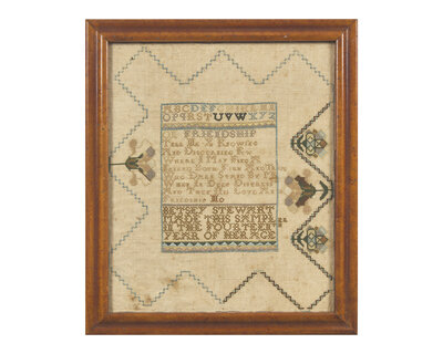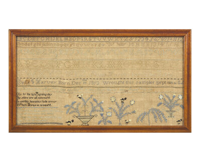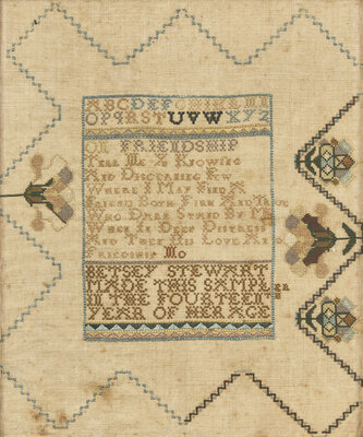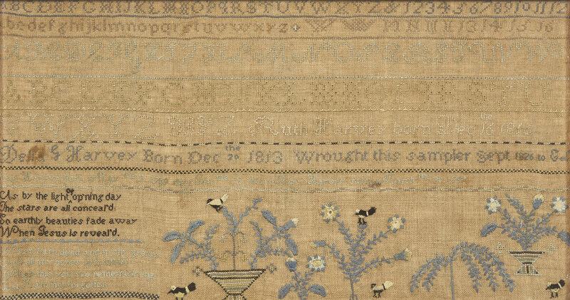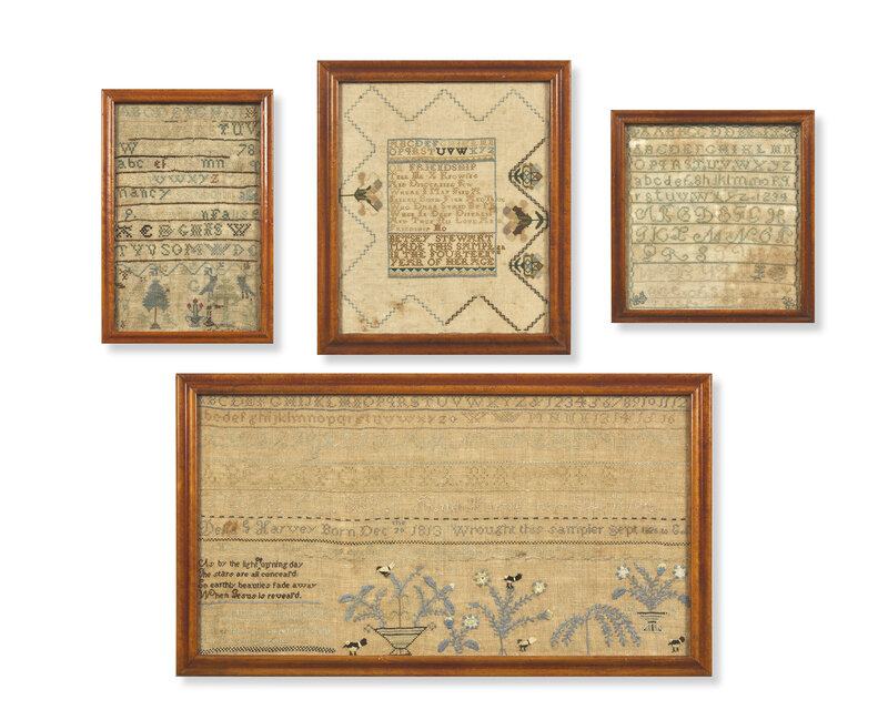 The first, of latitudinal configuration, with polychrome threads on linen ground, depicting floral urns and flowering trees with birds, along with alphabet, numerals, and pious verse, inscribed, "Delia G Harvey/ Born Dec the 20 1813/ Wrought this sampler 1826 to ED"; the second, with polychrome threads on cotton ground, showing cross-stitched zig-zag border with flowers, surrounding alphabet and poem, inscribed, "Betsey Stewart Made This Sampler in The Fourteenth Year of Her Age"; the third, a small alphabet sampler, worked with polychrome threads on linen ground, inscribed, "age of Sarah in... the... 12 year 1819"; and the last, a small alphabet sampler worked with polychrome threads on linen ground, depicting treads with owls and floral urn, initialed "V" and "G," with alphabet and numerals above"; all framed.