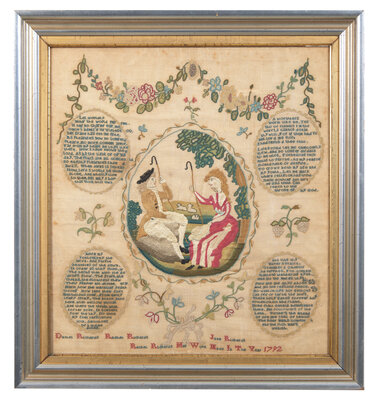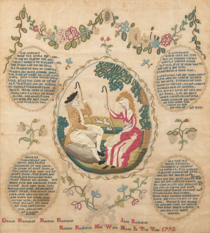 Bearing the inscriptions, "Wrought by Rachel Richards in 1792," and, "Daniel Richards, Rachel Richards and Jane Richards," worked with polychrome silk threads on a shear linen ground, framed; the frame bears a printed paper label, circa 1900, "From/ Earles Galleries/ and/ Looking Glass Warerooms No. 816 Chestnut Street,/ Philadelphia."