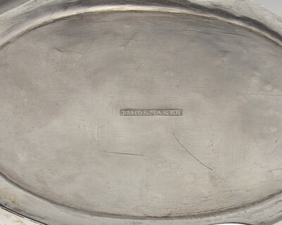 Comprising a teapot by Joseph Shoemaker, with hinged lid having urn-form finial, the body engraved with monogram, "JAF," marked to underside; and a covered sugar dish by Joseph Lownes, with two handles, gadrooned edges and bright-cut decoration, and a lid with urn-form finial, marked to underside.