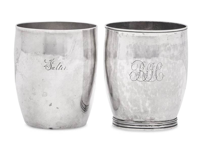 Comprising a cup by Moulton & Wood, or the partnership between Abel Moulton (1784-1850) and David Wood (1766-?), engraved to body, “Salter,” marked; and a cup by Thomas Knox Emery, with molded rim and foot, engraved to front with monogram, “RSJC,” marked.