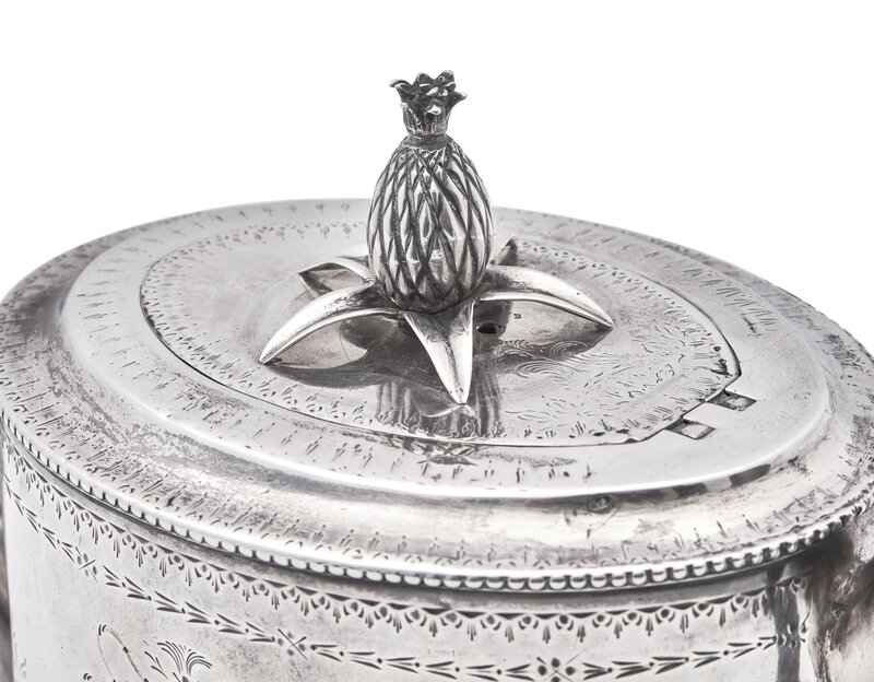 With rope and beaded rims, engraved with bright-cut decoration in the form of navette reserves flanked by swagged floral garlands, pineapple-form finial, marked to underside.