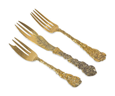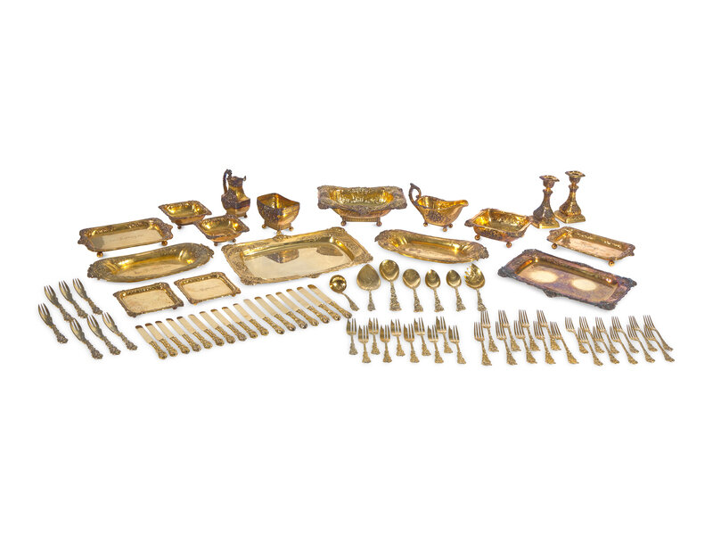 An Impressive Sterling Silver Gilt Dinner Service in the "Violet" Pattern Made for Washington Augustus Roebling and Emily Warren Roebling, Gorham Mfg. Co., Providence, RI, Most Pieces 1960, With Some Earlier Pieces Dated 1889