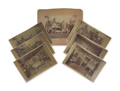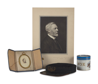 Comprising a hand-painted porcelain shaving mug by Ovington Bros., Brooklyn, enamel- decorated with birds and monogram, "W.A.R."; a Civil War kepi hat, by W.H.J. Dinsmore, Massachusetts; a cased photograph housed in a gilt pendant case, of Washington A. Roebling in Civil War uniform; a group of photographs, one gravure print depicting Washington A. Roebling, by J.M. Elliot of Philadelphia, Pennsylvania, inscribed and dated, "Washington A. Roebling/ March 1908," and interior and exterior views of his house in Trenton, New Jersey; and a group of documents and letters pertaining to Siegfried Roebling (1890-1936) and Mary Gindhart Roebling (1905-1994), including a letter written to Mary by Countess Sonia Fontaine, dated April 21, 1937, regarding her invention for airplanes, non-crashable "Fontaine Rotary Wings," in which she describes her struggle to launch production and imploring Mary to support the financing of the project, with attached photograph of the invention.