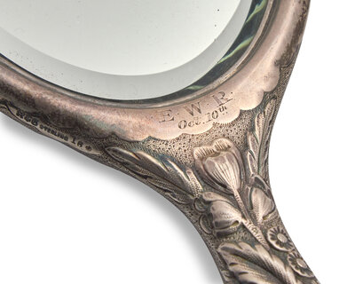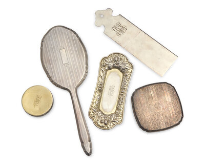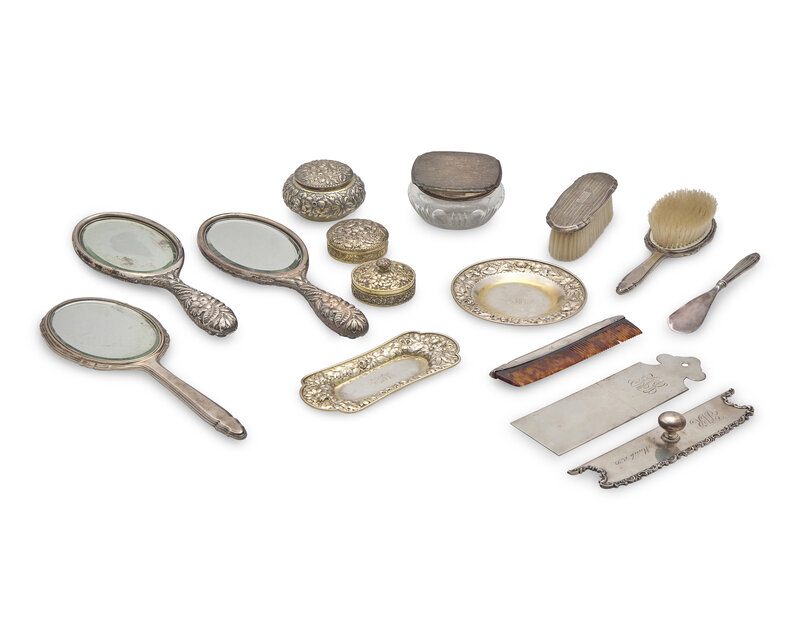 Comprising nine items made for Emily Warren Roebling by Gorham Mfg. Co., including two hand mirrors, one engraved, "E.W.R./ Oct. 10th," marked; two compacts, a powder box, and two small trays, all with gilt wash and engraved with stylized monogram, "EWR," marked; a scraper, engraved with monogram, "EWR," and date, "March 14, '93," marked; and a bookmark, engraved with monogram, "EWR," marked; and six items made for Mary Gindhart Roebling, by a few makers, including a hand mirror, a comb, a brush, and a shoe horn, by H.R. Morss & Co., Inc., Attleboro, MA, a brush by R. Blackinton & Co., Attleboro, MA, and a cut glass powder box with sterling silver lid, by R. Wallace & Sons, Mfg. Co., Wallingford, CT, all engraved with monogram, "MGR," most marked. (15 items total).