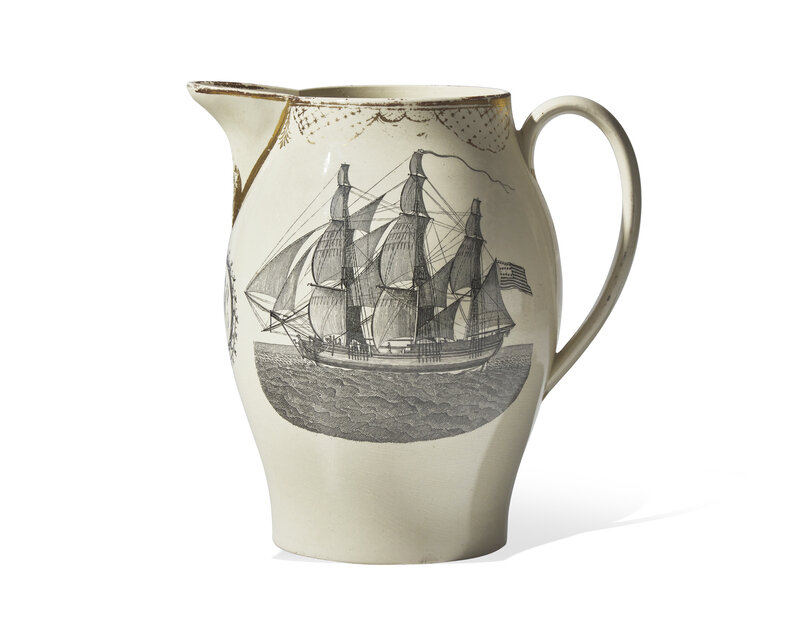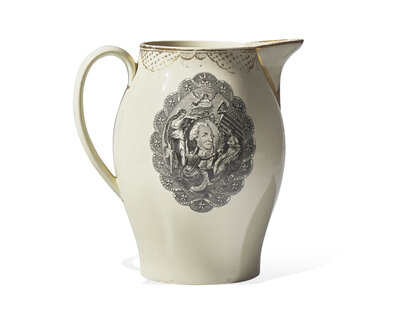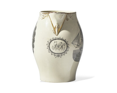 A Liverpool Gilt-Decorated and Transfer-Printed Creamware Presentation Pitcher, Early 19th Century