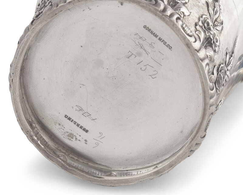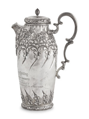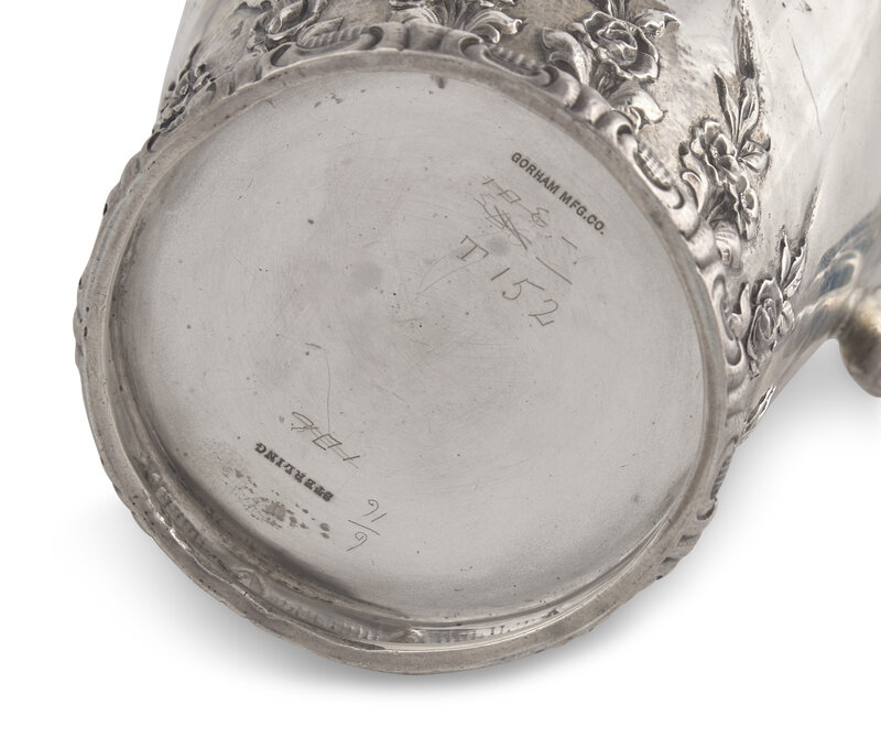 A Presentation Sterling Silver Floral Repousse Syrup Pitcher Awarded to Mrs. Washington Augustus Roebling, Gorham Mfg. Co., Providence, RI, Circa 1890s