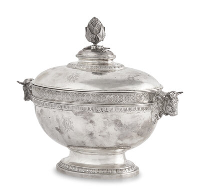 With buffalo head handles, artichoke-form finial, the body and lid engraved with stylized monogram, "CMC" (?), marked.