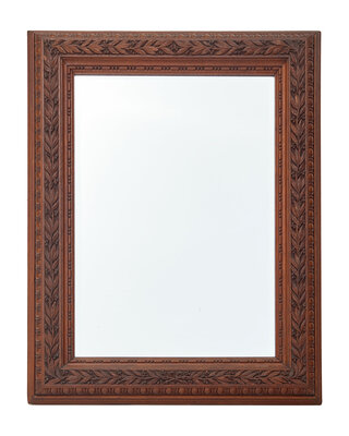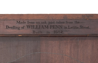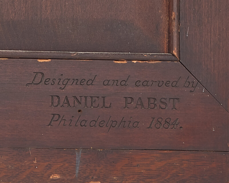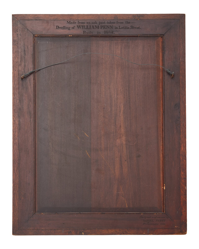 Inscribed on verso, "Made from an oak joist taken from the Dwelling of WILLIAM PENN in Letitia Street. Built in 1682" and "Designed and Carved by Daniel Pabst Philadelphia 1884." This frame is one of only two known signed Pabst works.