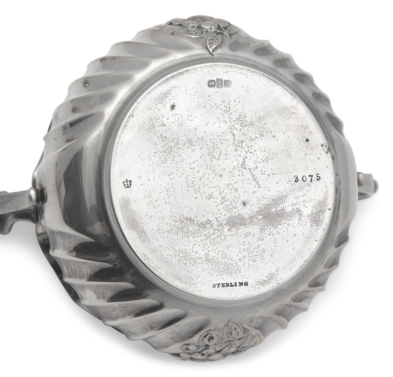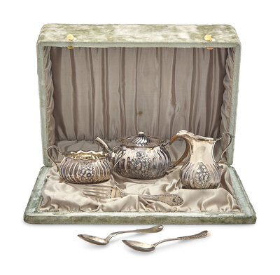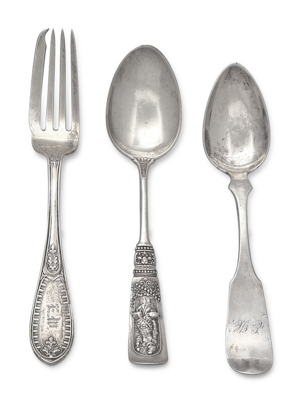 Comprising a teapot, a creamer, and sugar dish, all marked, housed in original velvet and satin-lined case; together with a sterling silver souvenir spoon by Gorham Mfg. Co., Providence, RI, engraved to underside of handle, "Cleveland," marked; a coin silver spoon marked "Bixler," engraved with monogram, "EH"; and a fork by Tiffany & Co., New York, NY, engraved with monogram, "E.W.," marked.