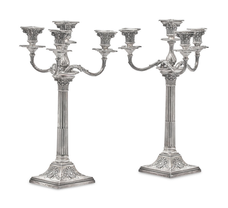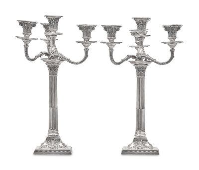 A Pair of Victorian Weighted Sterling Silver Four-Light Candlesticks, James Kebberling Bembridge for Hawksworth, Eyre, & Co., Ltd., Sheffield, 1882