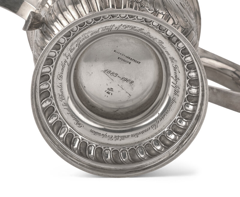 Engraved with monogram, "CSB," engraved to underside, "Presented to Charles Bradley by the officers and staff of P. Ballantine & Sons on the Twenty-fifth Anniversary of his connection with the Corporation/ 1883-1908," marked.