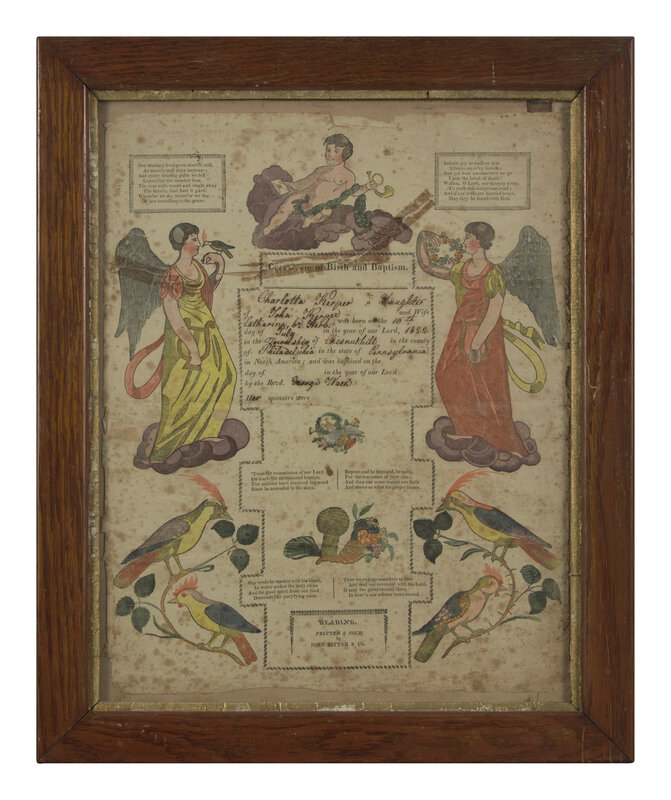 A Printed and Hand-Colored Fraktur Birth and Baptism Record for Charlotte Kerper, Chestnut Hill, Philadelphia, PA, Dated "1822"