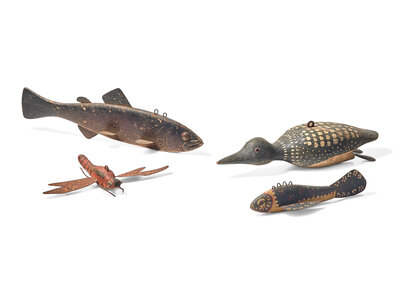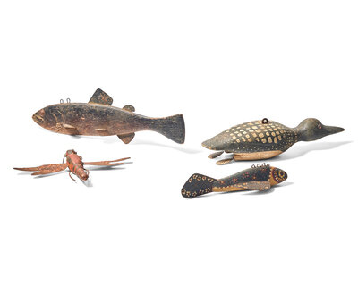 A Group of Four Carved and Painted Ice Fishing Lures, Attributed to LeRoy Howell, Hinckley, MN, and Various Makers, First Half 20th Century