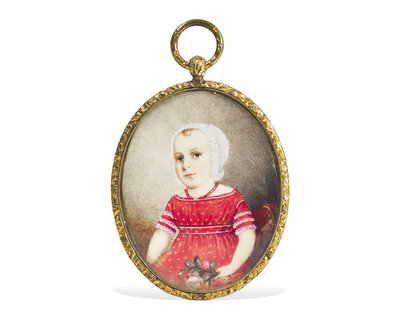 American School 19th Century, A Portrait Miniature of a Young Girl Holding Flowers