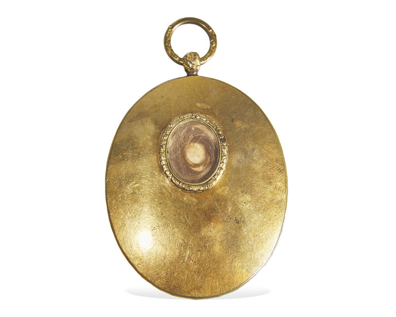 Housed in gilt pendant case, the verso with aperture containing hairwork, watercolor.