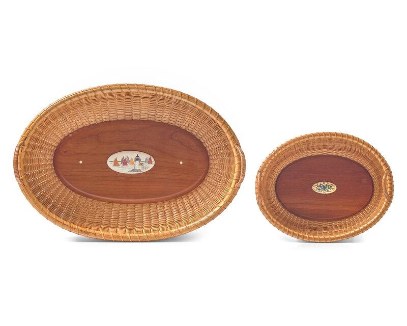 Comprising five lightship baskets by Susan Chase Ottison, including two with scrimshaw plaques to interior wells, one depicting lighthouse with sailboats, the other depicting flowers, each signed to underside, "Susan Chase Ottison/ Nantucket Island," and dated, respectively: "1980", "1988", "1996", "2001", and "2003"; a lightship gathering basket, by Richard Cifranic, signed and dated to bottom, "Richard Cifranic/ Nantucket Island/ 1986"; a lightship bud vase basket, by Paul Willer, signed and dated to underside, "Willer/ 1984"; a miniature lightship basket, signed to underside, "C.P./ Nantucket"; a miniature Shaker basket, New England, 19th century; and a handled and lidded basket.