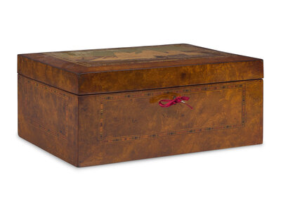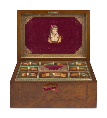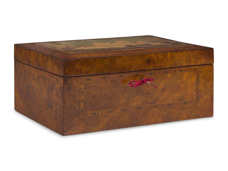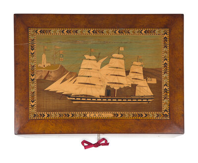 Inlaid with polychrome marine scene and the inscription, "E. A. Wallis," the interior fitted with pincushion and compartments having covers inlaid with national and signal flags.
