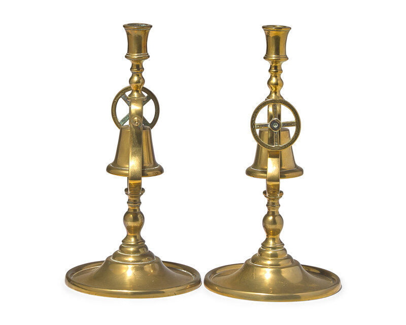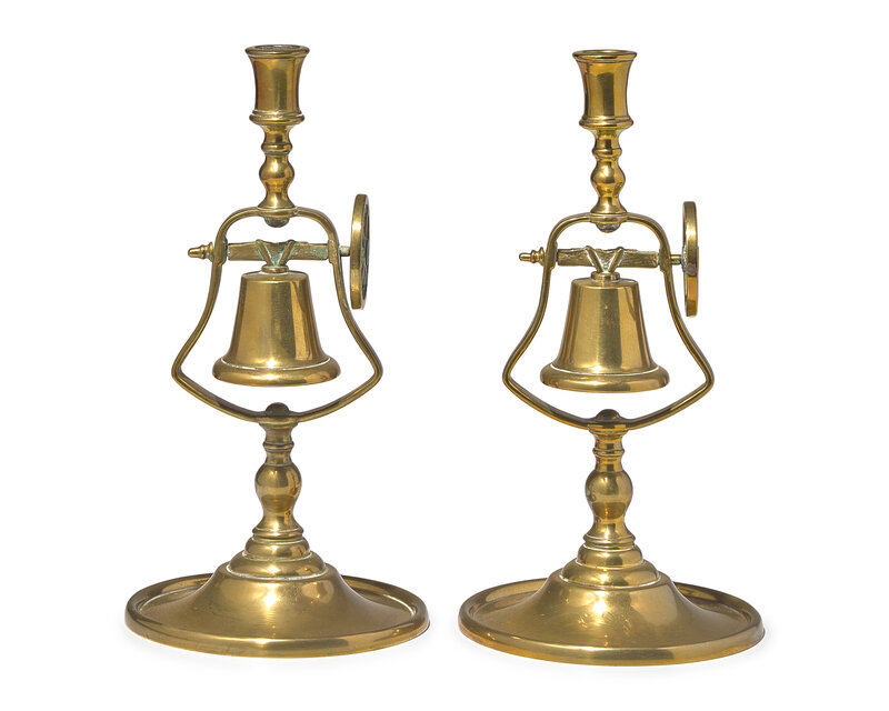 A Pair of Brass Tavern Candlesticks with Service Bell, England, Circa 1840