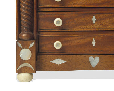 With turned bone drawer pulls, on bone bun-form feet.