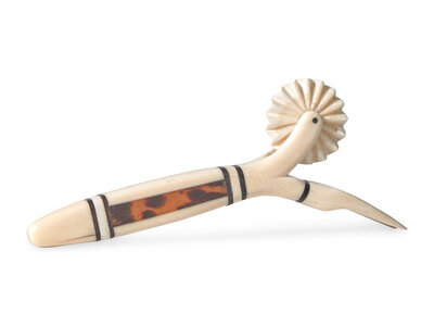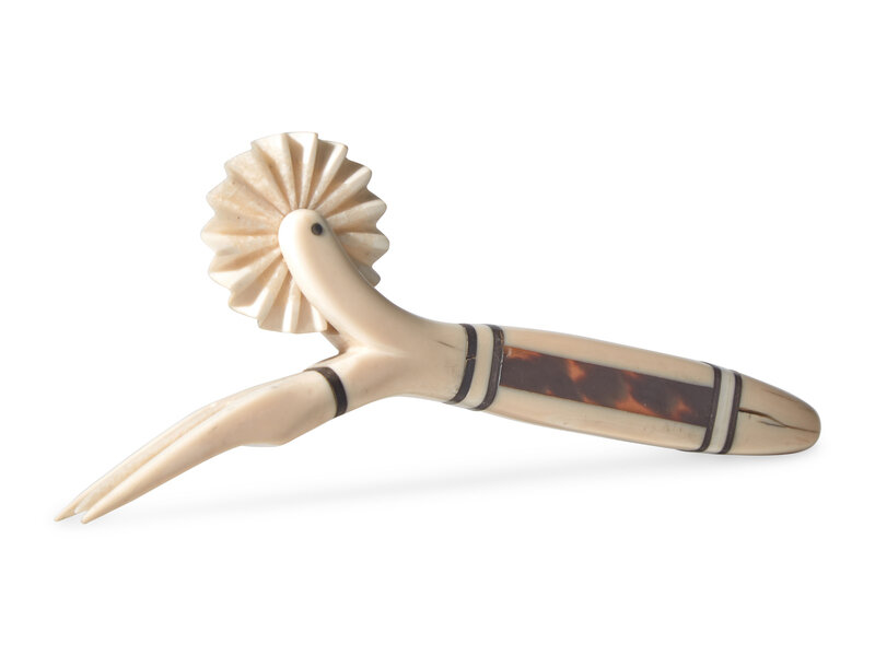 A Scrimshaw Carved Whale Tooth Pie Crimper and Fork, 19th Century