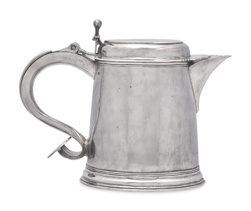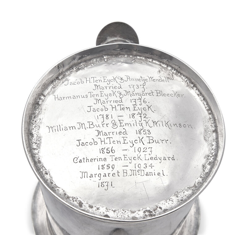 With tapered cylindrical body having molded foot, the hinged, domed and stepped lid with engraved and cutwork front and spiral thumb-rest, with scrolled handle with applied and lapped decorative elements at top and plain disc terminal to bottom, also engraved with monogram, "A/ IE," the top of lid engraved "HTE," with later spout, the underside later engraved, "Jacob H. Ten Eyck & Annetje Wendell/ Married 1737/ Harmanus Ten Eyck & Margaret Bleecker/ Married 1776/ Jacob H. Ten Eyck/ 1781-1872/ William M. Burr & Emily K. Wilkinson/ Married 1853/ Jacob H. Ten Eyck Burr/ 1856-1927/ Catherine Ten Eyck Ledyard/ 1859-1934/ Margaret B. McDaniel/ 1871," marked twice to upper edge near handle.