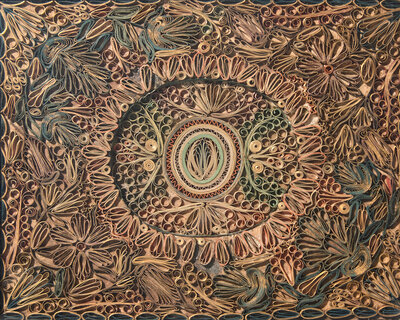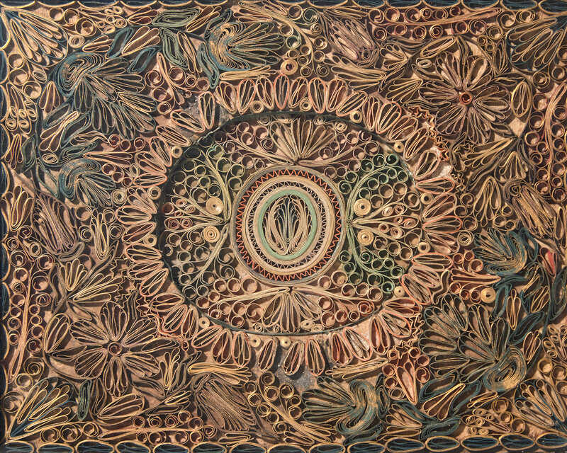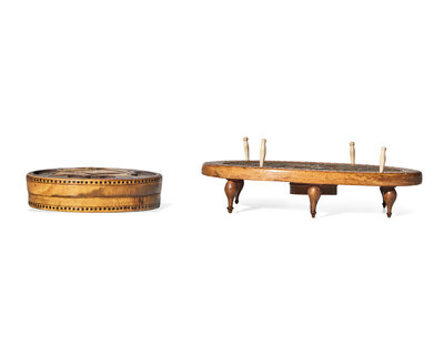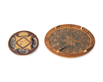 A Framed Quill Work Picture and a Quill Work and Inlaid Wood Cribbage Board, England, 18th Century