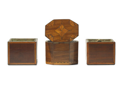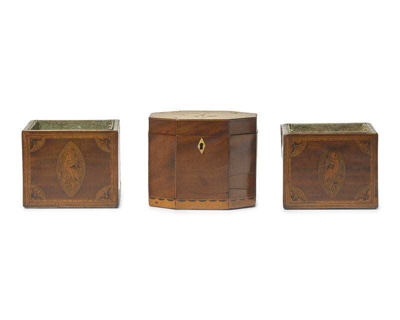 A Pair of George III Inlaid Mahogany Cache Pots and a Tea Caddy, Circa 1800