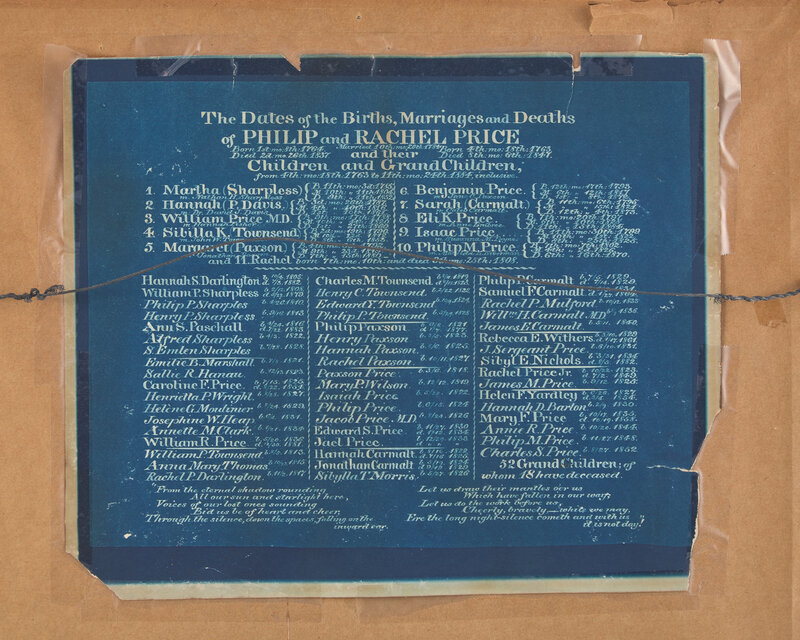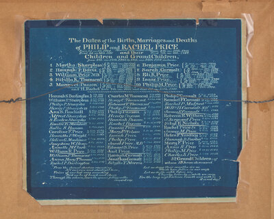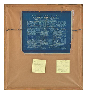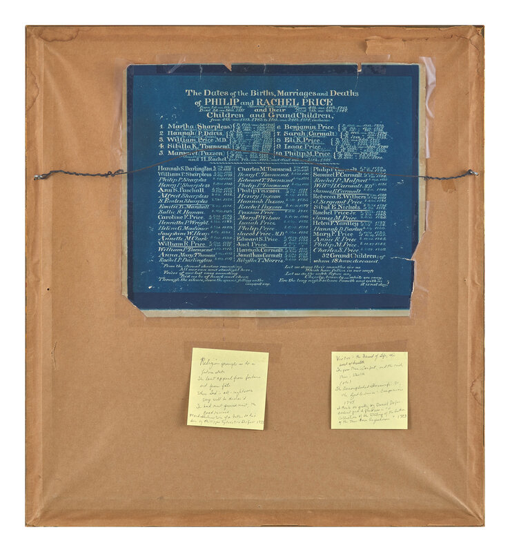 Worked with silk threads on a linen ground, inscribed, "Martha Price 12 Mo. th 16 1797," with photocopy of family genealogy on verso, framed.