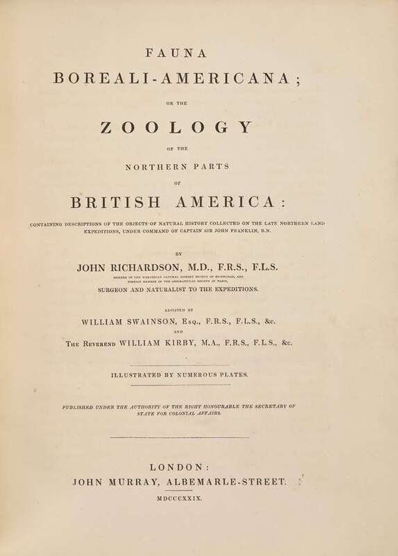First edition of Sir John Richardson's account of the natural history of the Canadian Arctic. Richardson accompanied Sir John Franklin on both of his overland expeditions to the Canadian Arctic between 1819 and 1827, and made several discoveries and contributions to the knowledge of the region. These two volumes detail the region's quadrupeds and birds, both depicted in highly detailed etchings and hand-colored lithographs.