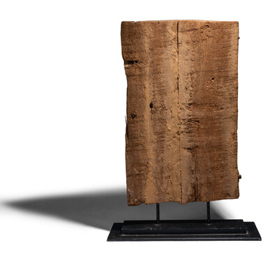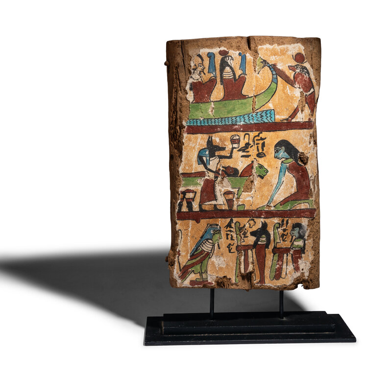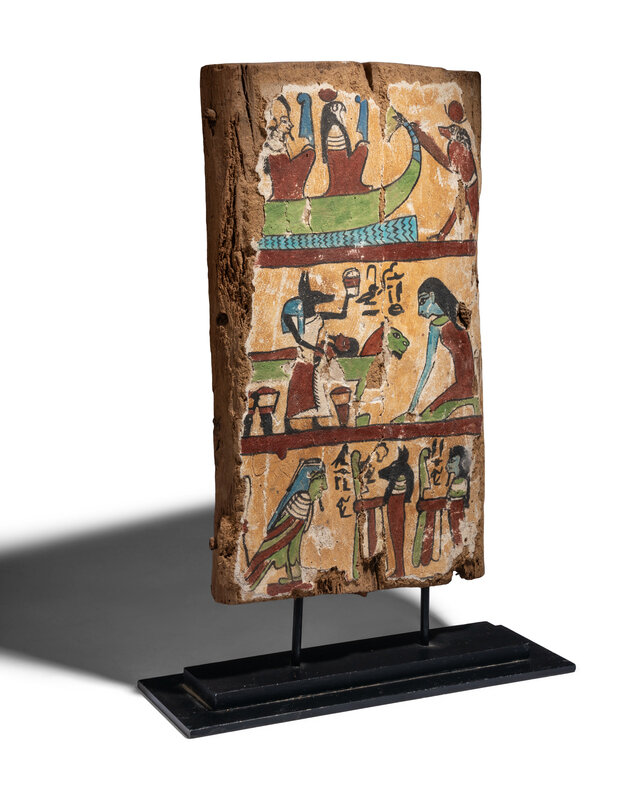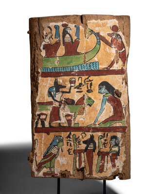 An Egyptian Painted Wood Sarcophagus Fragment with a Boat Scene