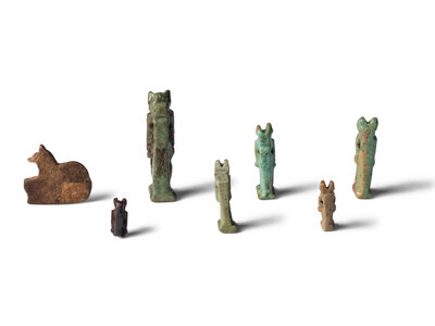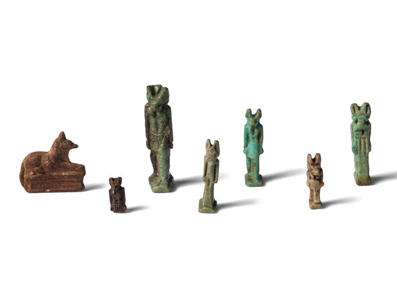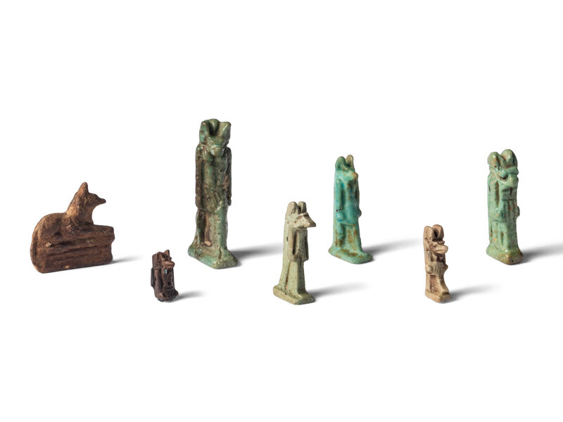 Seven Egyptian Faience and Stone Anubis Amulets