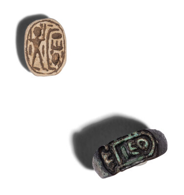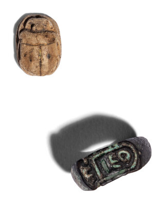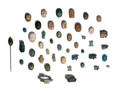 Forty-Five Egyptian Faience Amulets, Scarabs, and Rings