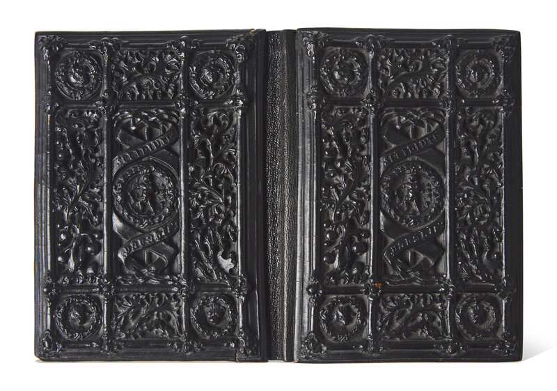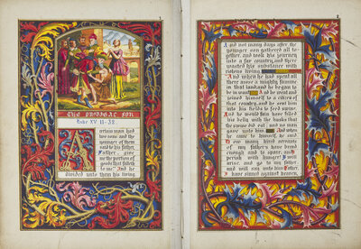 (London: Longman, Brown, Green, & Longmans, ca. 1846). 12mo. Unpaginated. Chromolithographic illuminated leaves containing different bible parables, rubricated with gold and color borders by Noel Humphreys. Original elaborately decorated papier-mache and plaster boards, sympathetically rebacked; all edges gilt; marbled endpapers; index leaf bound in at front; scattered toning.